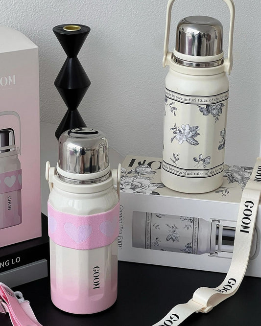 GOOM [THE GRIP] 32 oz Insulated Water Bottle with Lid, Carrying Strap and Strainer - Floral Whisper